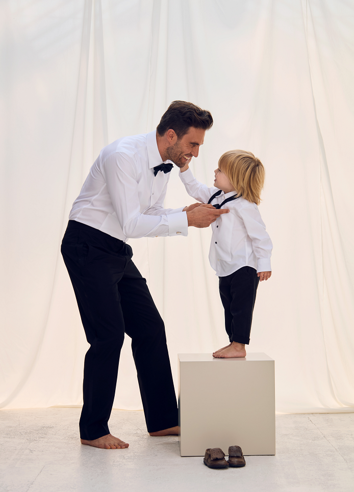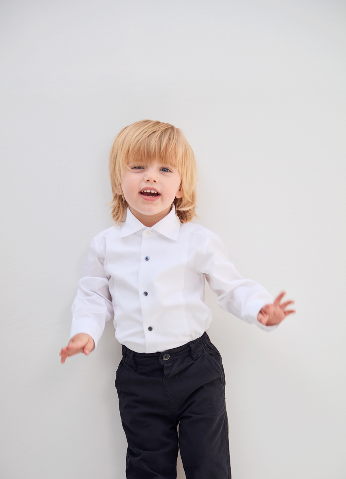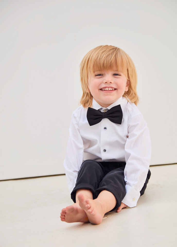 Dieser Artikel wird mit schwarzer Fliege und klassischem Tuxedo getragen und ist mit polierten Schuhen ein unverzichtbares Hemd in jeder Kindergarderobe.