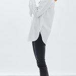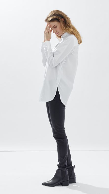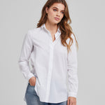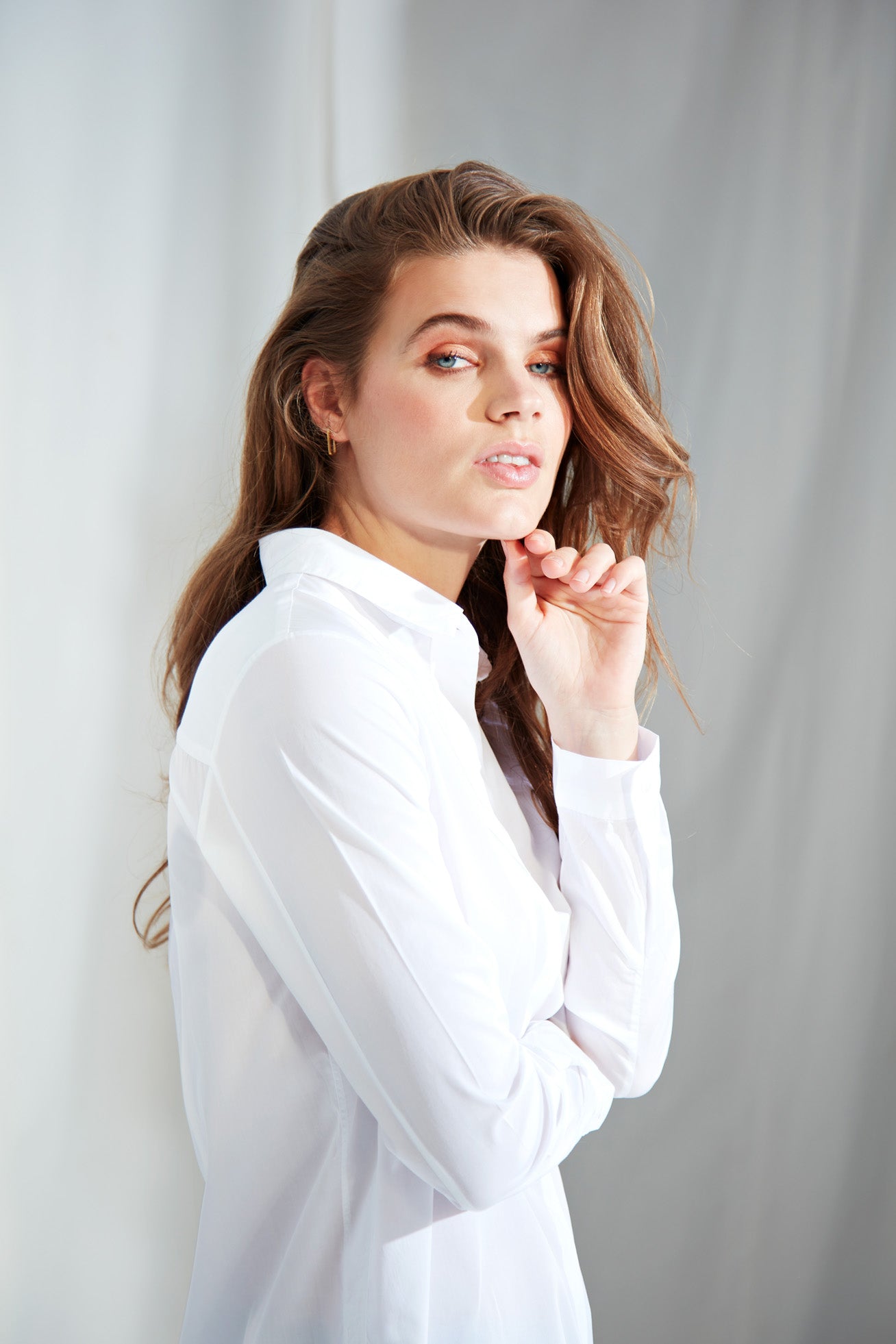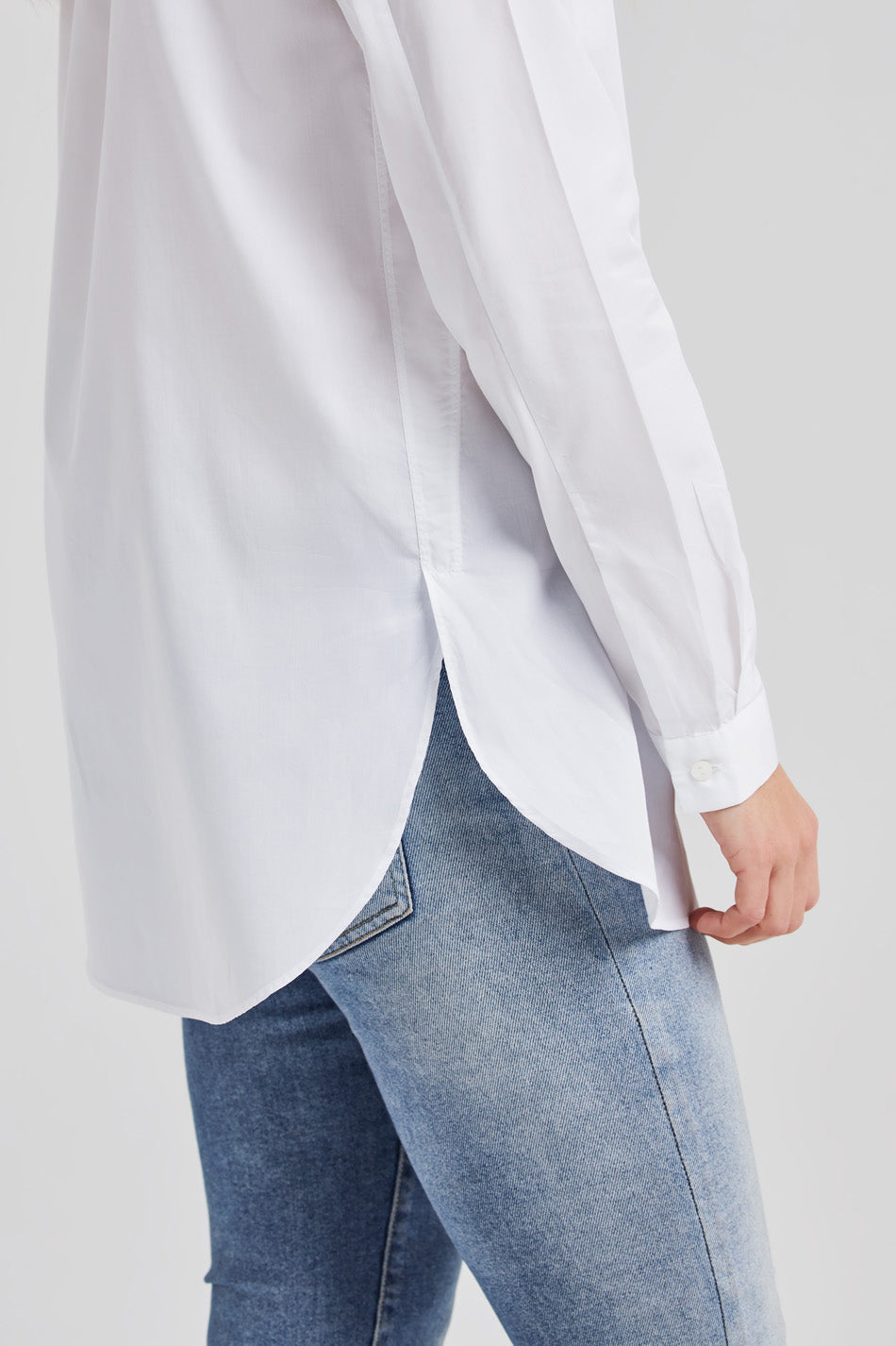 • Klassischer Blusenkragen mit runder Sportmanschette