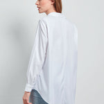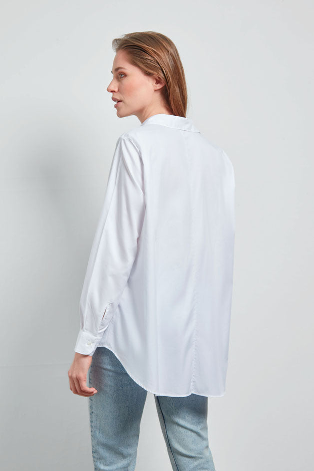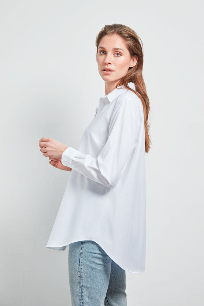 • Klassischer Blusenkragen mit runder Sportmanschette