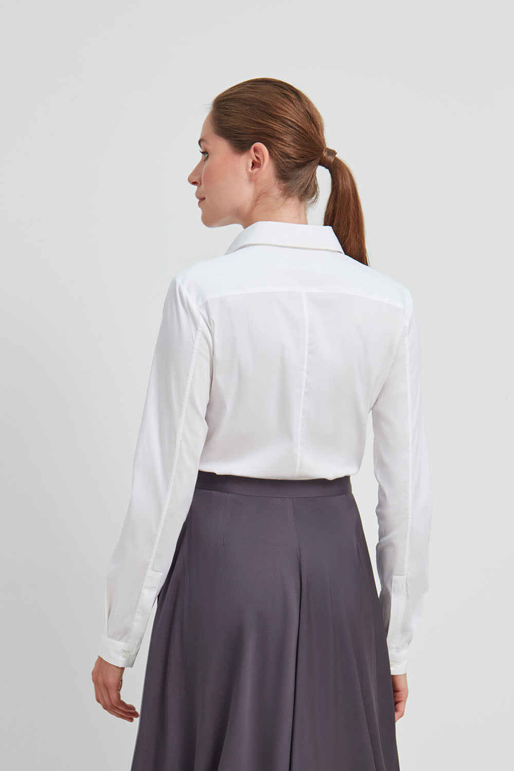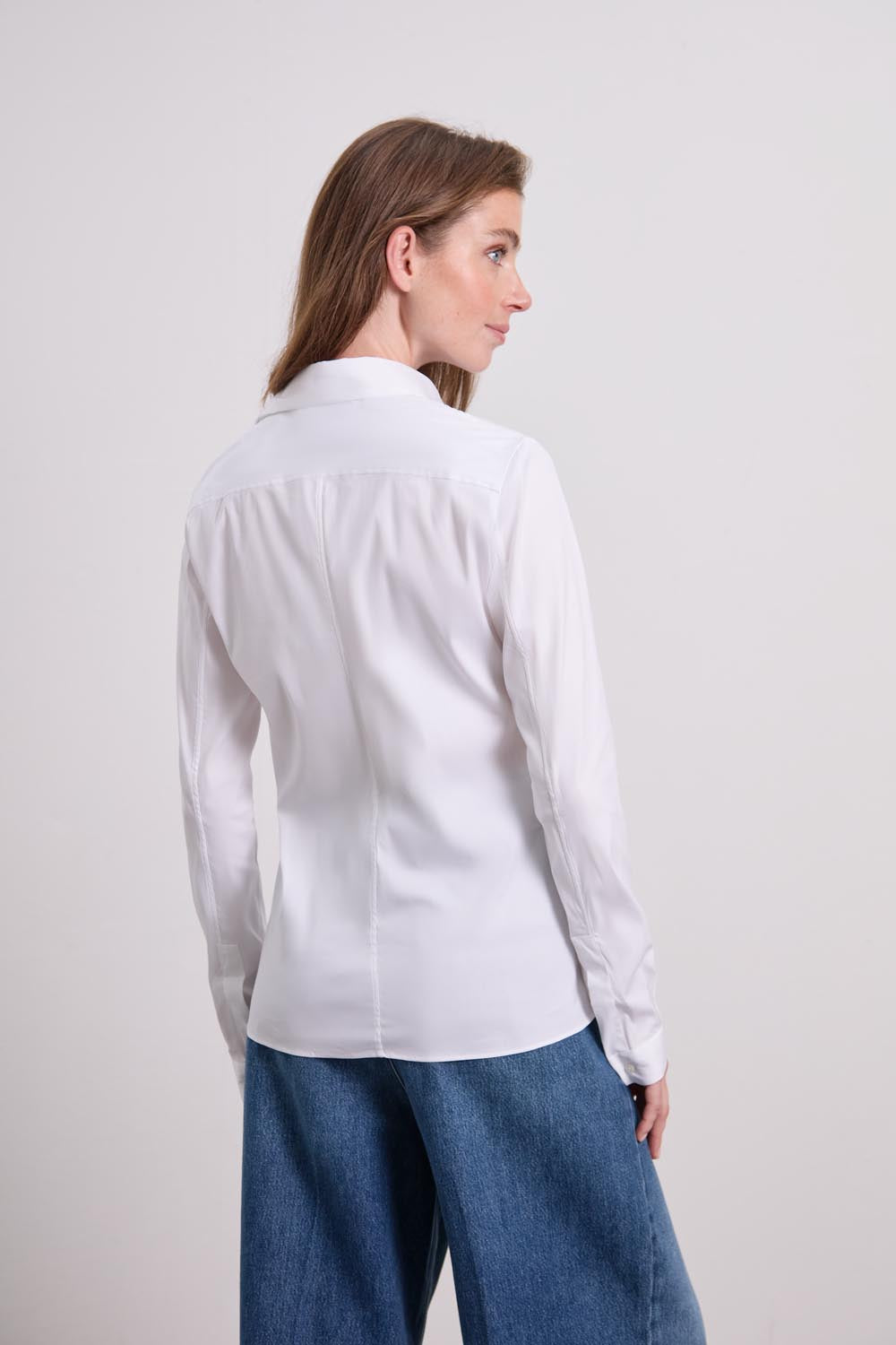 • Schmaler Schnitt mit kleinem Kragen und runder Manschette